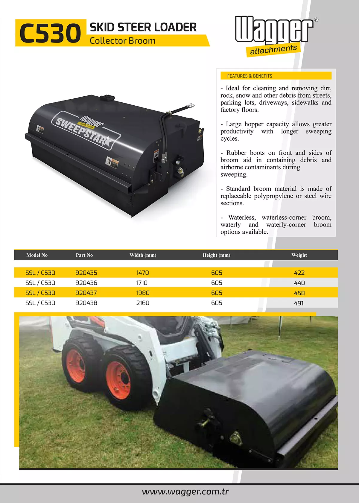 Wagger C530 serisinin açık saha performansını bir adım öteye taşıyan C530 Süpürge Ataşmanı, sadece süpürmekle kalmaz, üzerindeki entegre kova (hazne) yapısı sayesinde tüm atıkları toplayarak hapseder. Özellikle tozun ve atığın çevreye yayılmaması gereken hassas alanlar için geliştirilen bu “Sweepstar” serisi, Skid Steer Loader (Mini Yükleyici) ve diğer kompakt araçlarla tam uyumlu çalışır.