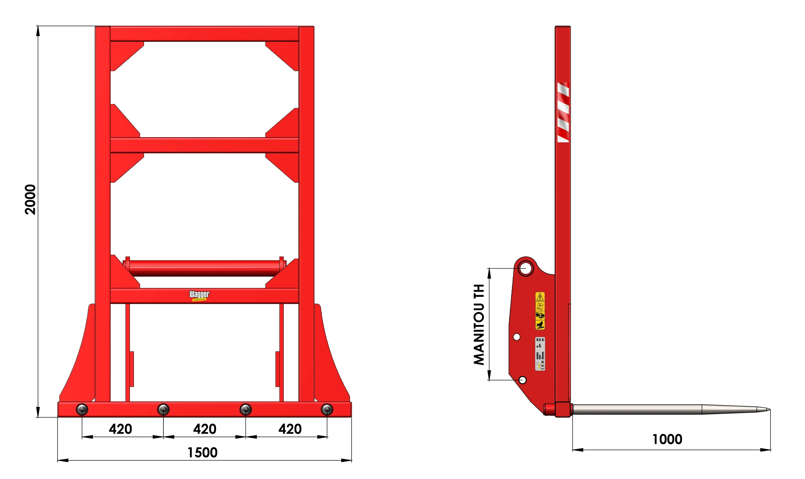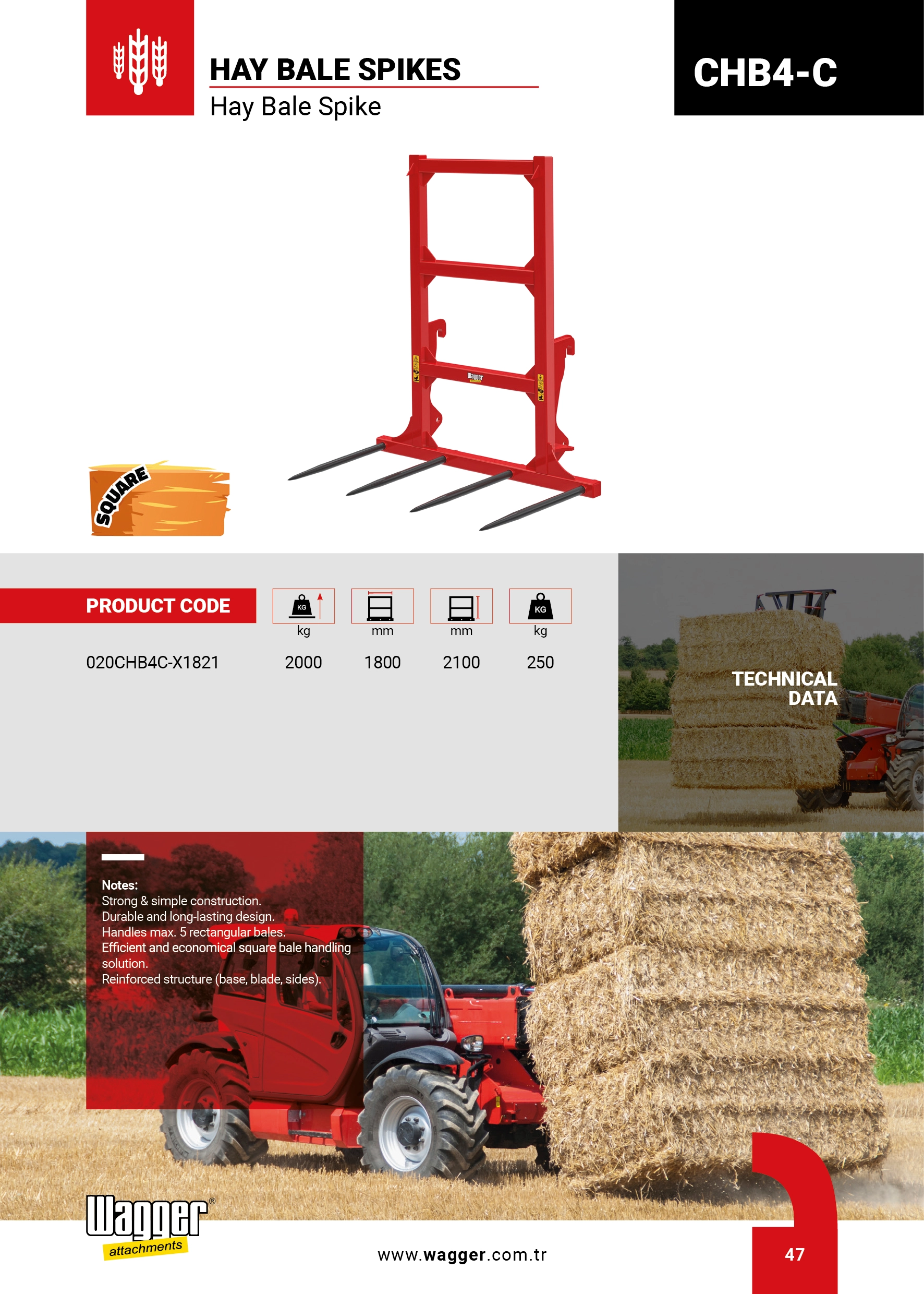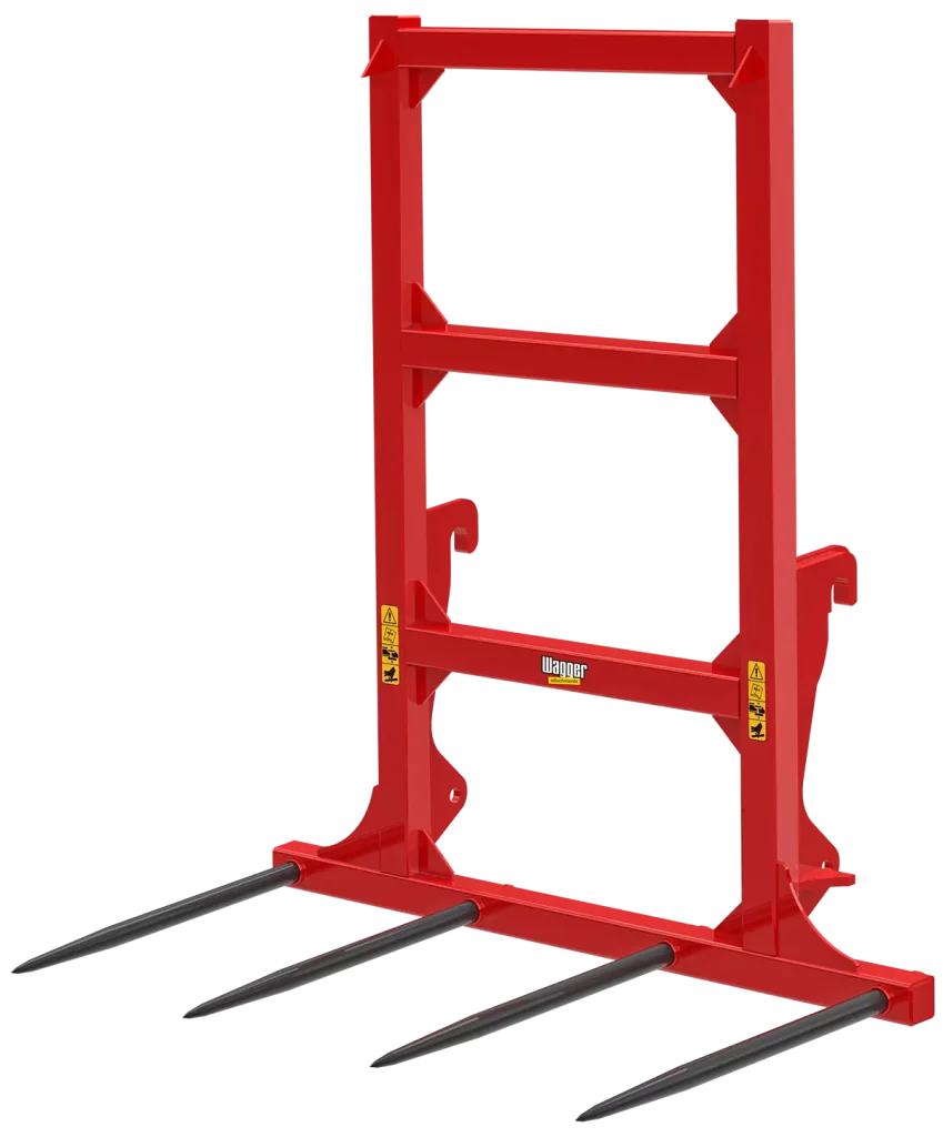 Wagger Sabit – 4 Şişli Kare Saman Balya Ataşmanı, özellikle telehandler makineleriyle saman, yonca ve diğer tarımsal balyaları taşımak için tasarlanmış yüksek dayanımlı bir ataşmandır. Kare veya dikdörtgen formdaki saman balyalarının güvenli, hızlı ve dengeli bir şekilde taşınmasını sağlar.