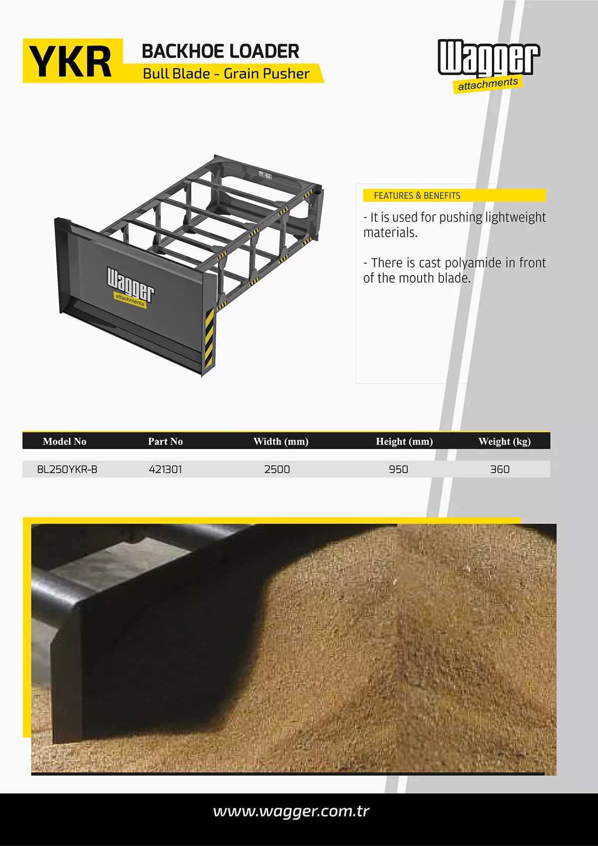 Wagger Hububat Küreme Ataşmanı, tahıl, yem, pelet ürünlerin depo yığma ve düzleme işlemlerinde yüksek verim ve hassas kontrol sunmak üzere dizayn edilmiş profesyonel bir ataşmandır. Telehandler makinelerine uyumlu yapıdadır ve hem malzeme birikimini önlemeye hem de yükleme alanlarını düzenli tutmaya yardımcı olur.